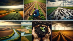 A vast Iowa farmland with rich, black soil, showing signs of erosion and sparse vegetation, under a cloudy sky. A farmer using sustainable farmi