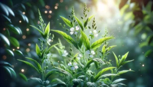 Andrographis plants, showcasing the distinctive small green leaves and intricate white flowers with a blurred natural backgro
