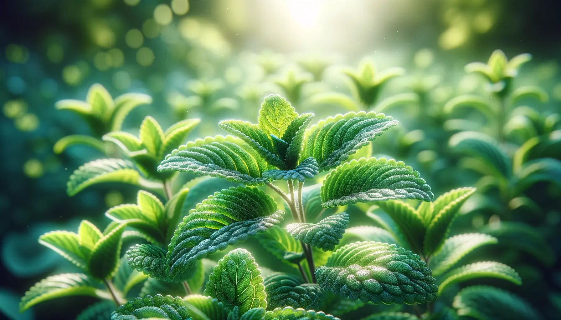 Lemon balm plants, focusing on the lush green leaves with a soft, fragrant appearance. The background is a blurred garden set