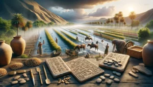 Ultra-realistic image of an ancient Mesopotamian farming scene with the Euphrates River in the background, showing people using a shaduf to irrigate c