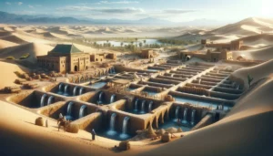 Ancient Moroccan irrigation system ‘Khettara’ in the desert. Show a series of interconnected wells and underground tunnels extending from a water sour