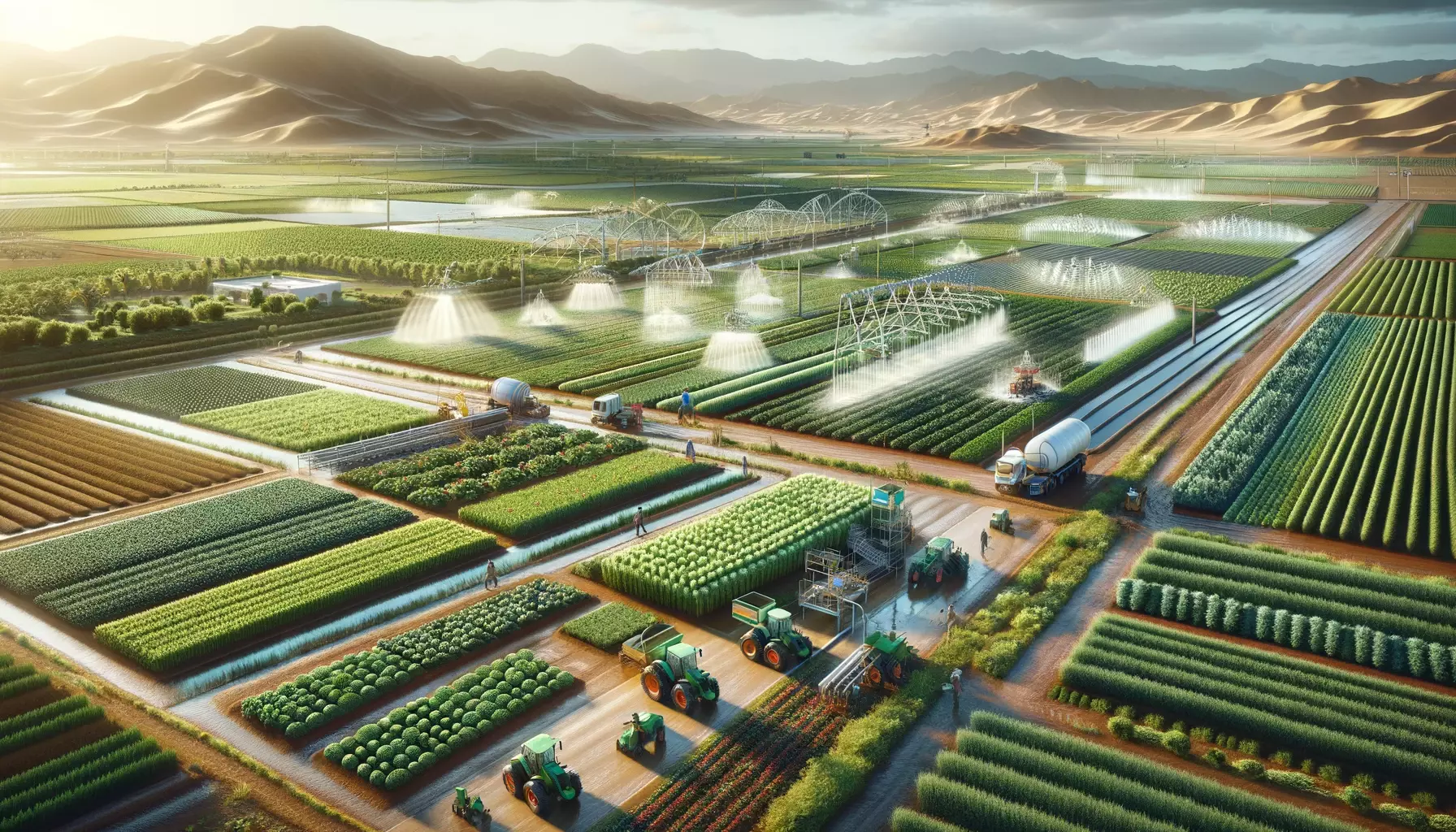 Green Morocco Plan in action, showcasing a modern agricultural field in Morocco. Include diverse crops, advanced farming machinery, and irrigation sys