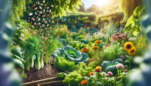 An-image-showing-a-thriving-garden-full-of-diverse-plants-with-a-focus-on-several-flourishing-species-symbolizing-the-benefits-of-seed-saving.-The-g